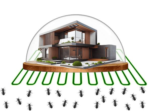 Na descupinização de solo, uma barreira química protetora é criada ao tratar toda a estrutura do local, incluindo madeiras, jardins e solo, utilizando um sistema eletrônico para impedir a aproximação de cupins.